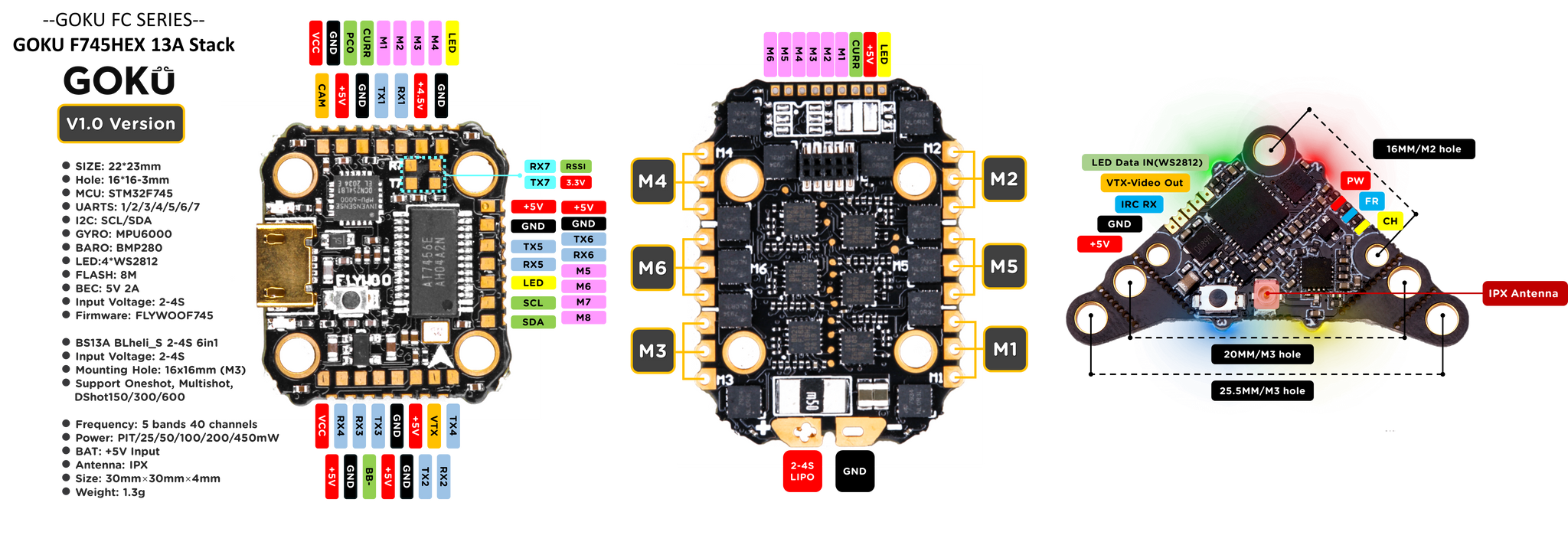 GOKU HEX F745 16X16 STACK Use powerful F745 BGA chip,barometer, black box, WS2812LED,support 7 complete hardware serial ports, I2C and other functions are all open ! Enough to meet all FPV needs.